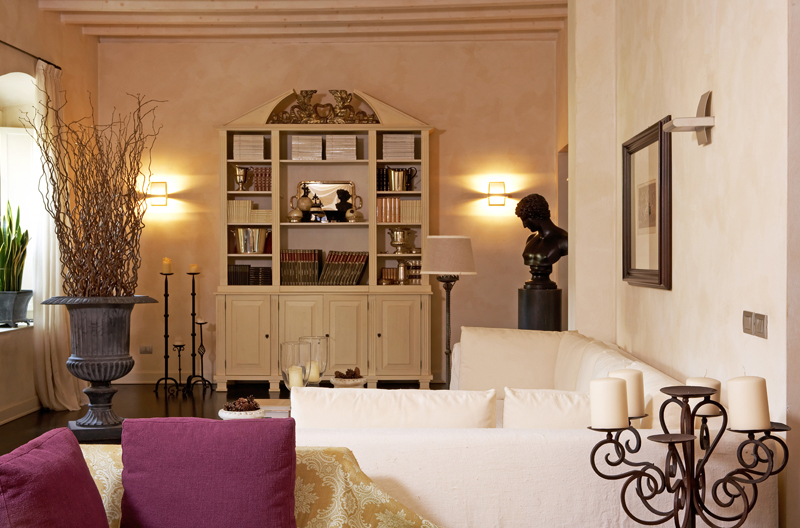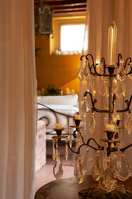 Ampia e luminosa la cucina si affaccia direttamente sul portico utilizzato in tutti i mesi dell’anno. Esaltano i mobili chiari e gli oggetti decorativi, i toni scuri del pavimento e delle pareti in netto contrasto con travi avorio e tendaggi in pesante lino. I soffitti in mattoni rossi della zona notte, originali dell’epoca della dimora, rendono molto scenografici gli interni. Una quinta realizzata con una garza grezza