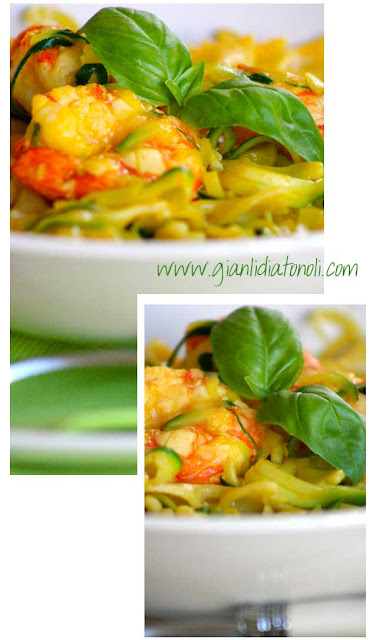 Mentre bolle l’acqua, taglio a julienne qualche zucchina con quest’attrezzino magico. In una casseruola verso un filo di olio extravergine d’oliva, i gamberi e per ultimo le zucchine. Lascio cuocere i gamberi e le zucchine leggermente croccanti. In una ciotolina sciolgo lo zafferano con un pò d’acqua calda. Quando l’acqua bolle, verso la pasta ( lunga o corta a seconda della richiesta dei lupi) che verrà scolata al dente. Unisco il tutto e aggiungo una fogliolina di basilico ad ogni piatto.